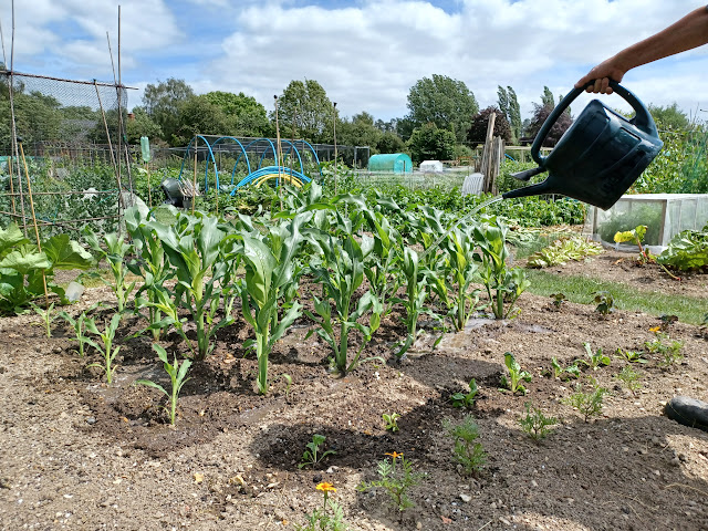 The Incredible sweetcorn that Nia gave us is growing at a pace. I had to stomp the earth around them as they’ve had some really strong winds to contend with. The four tiny plants are the Lark variety that we managed to germinate - they shouldn’t be affected by cross-pollination apparently.