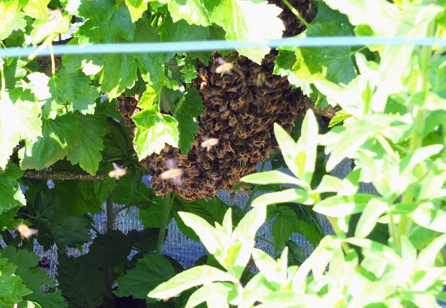 By the time I got there the excitement was over so I just took a few photos. I think they're honey bees. The swarm had selected a blackcurrant bush to rest on while the bee scouts went to find a suitable location to re-home.